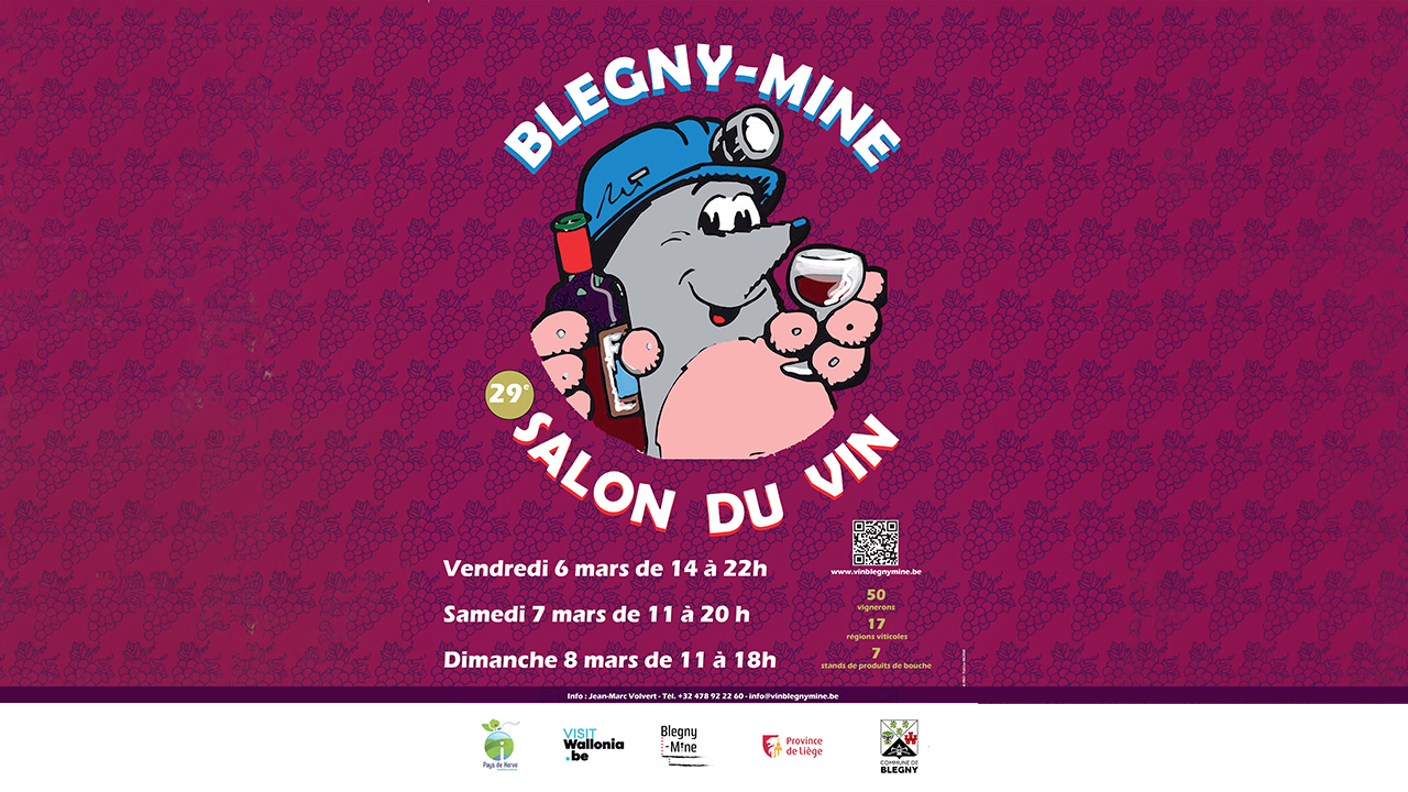 Le Salon du Vin de Blegny-Mine est une organisation des Œuvres scolaires Communales de Saint-Remy asbl en collaboration avec la Confrérie des « Peûres di Sint-R’Mèy » et la Confrérie des « Maîsses Houyeûs dè Payis d’Lîdje », avec le soutien de la Wallonie, de la Province de Liège, de la Commune de Blegny, de Blegny-Mine et de l’Unité Scoute 12 BM de Blegny.