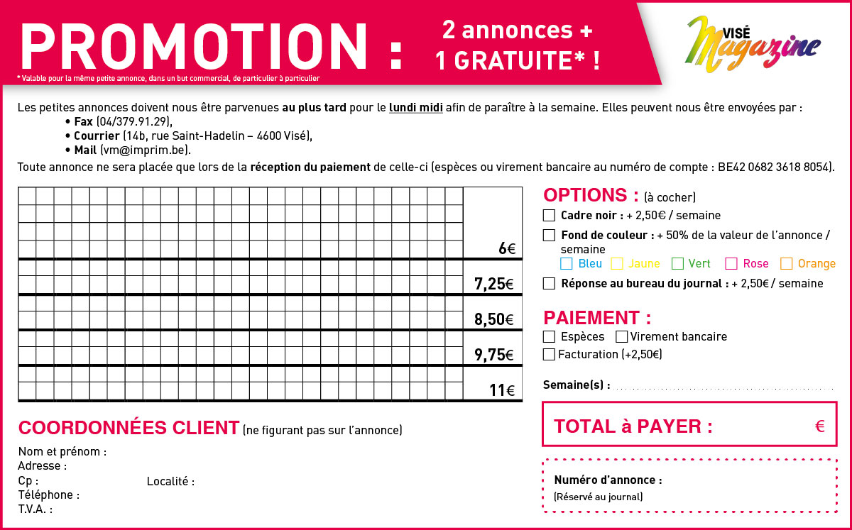 Remplissez-le puis envoyez-le sur l’adresse vm@imprim.be ou déposez-le directement à notre bureau (rue Saint-Hadelin, 14b à 4600 Visé)
